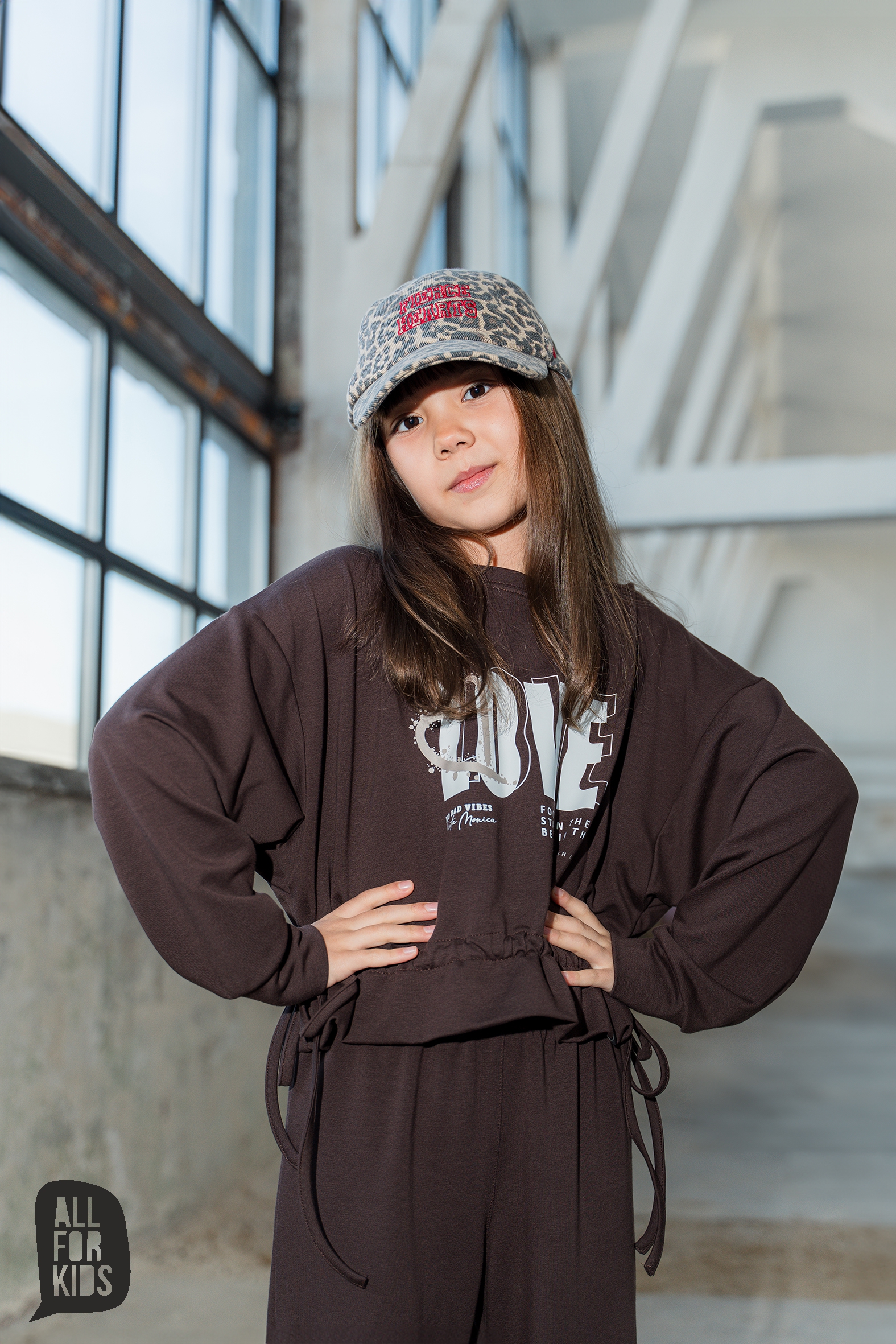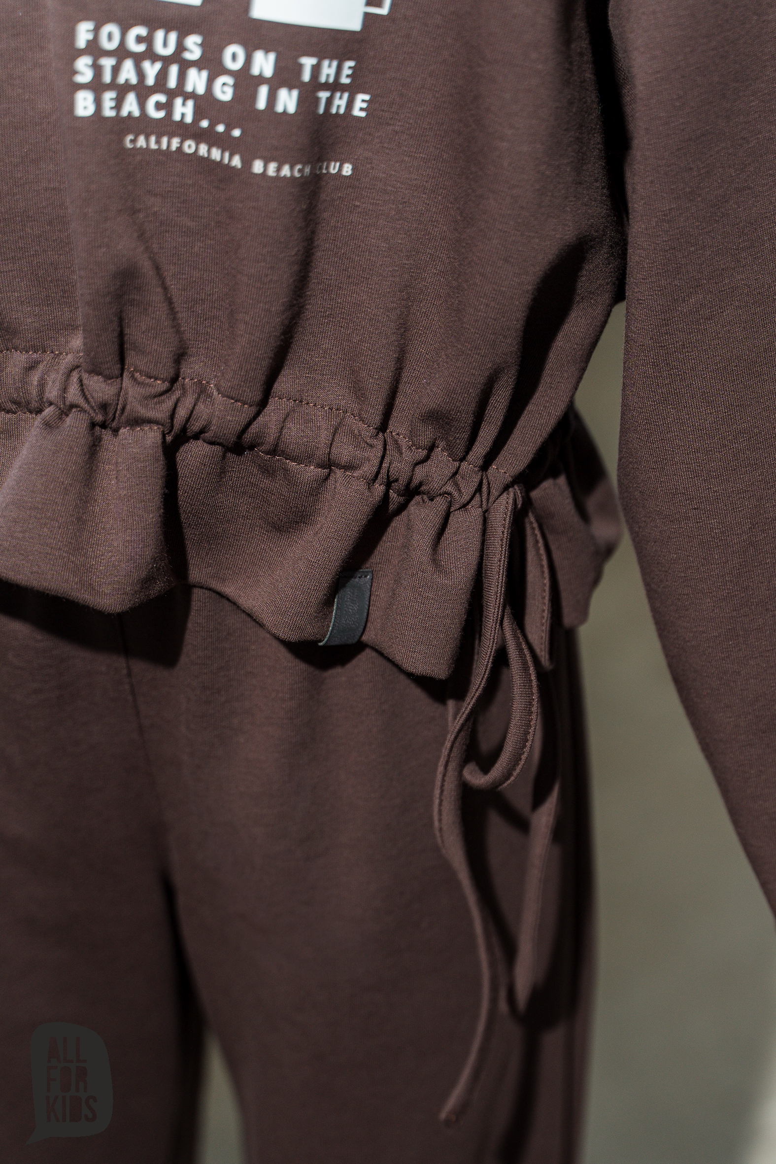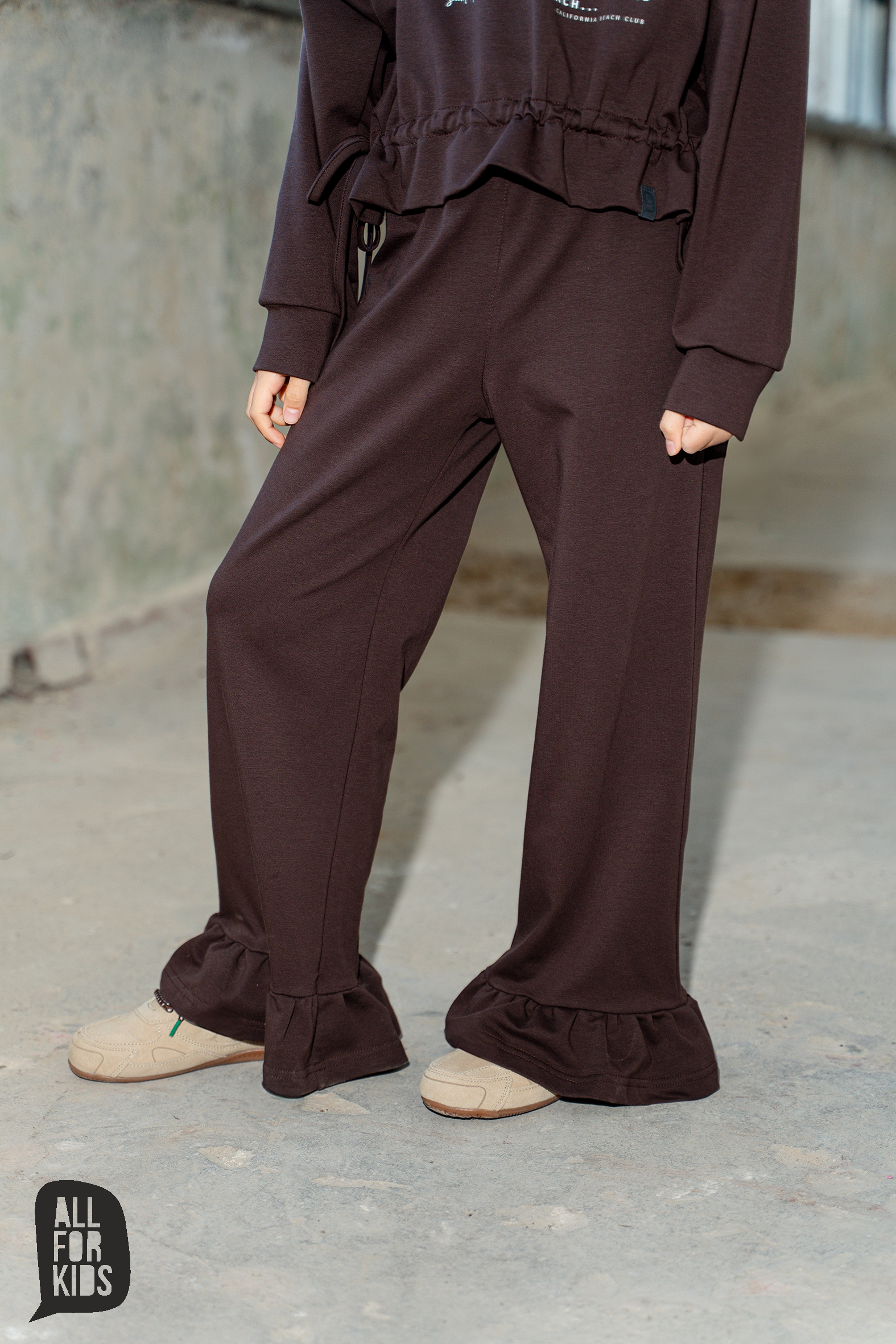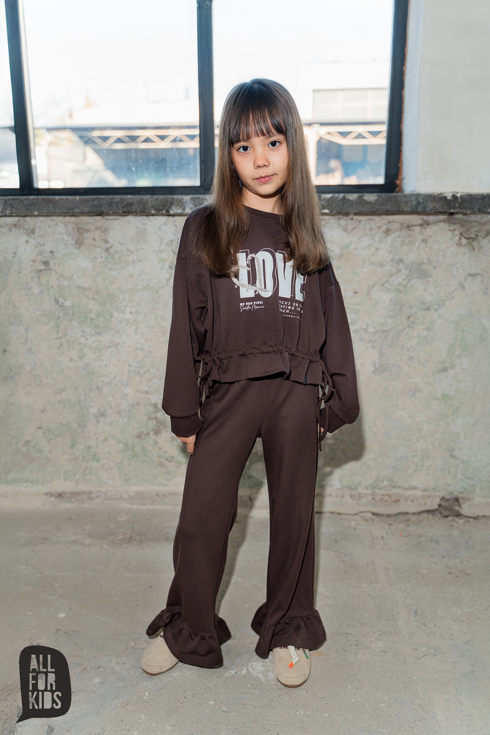 Dziewczęcy brązowy dres All for Kids składający się z bluzy i spodni. Bluza „LOVE” posiada ściągacz na dole, dzięki czemu świetnie układa się na sylwetce. Spodnie wykonane z miękkiej dzianiny, ozdobione falbankami na dole, dodają całości uroku. Wygodny i stylowy zestaw idealny na co dzień.