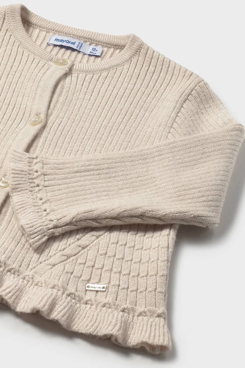 Stylowy kardigan niemowlęcy Mayoral wykonany z miękkiej, cienkiej dzianiny. Ma prosty, wygodny fason, który nie krępuje ruchów, oraz praktyczne zapięcie na guziki ułatwiające ubieranie. Ozdobne falbany dodają mu uroku i elegancji.