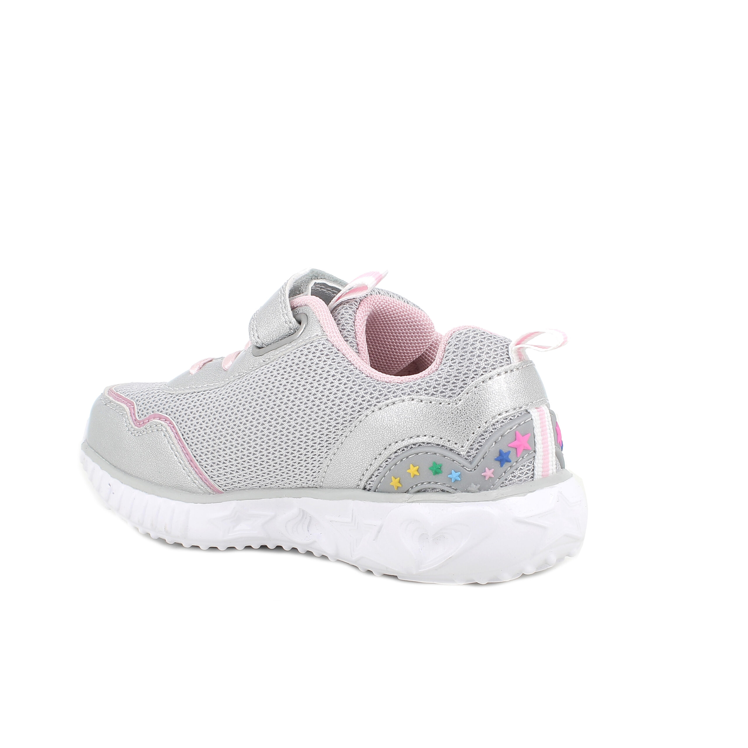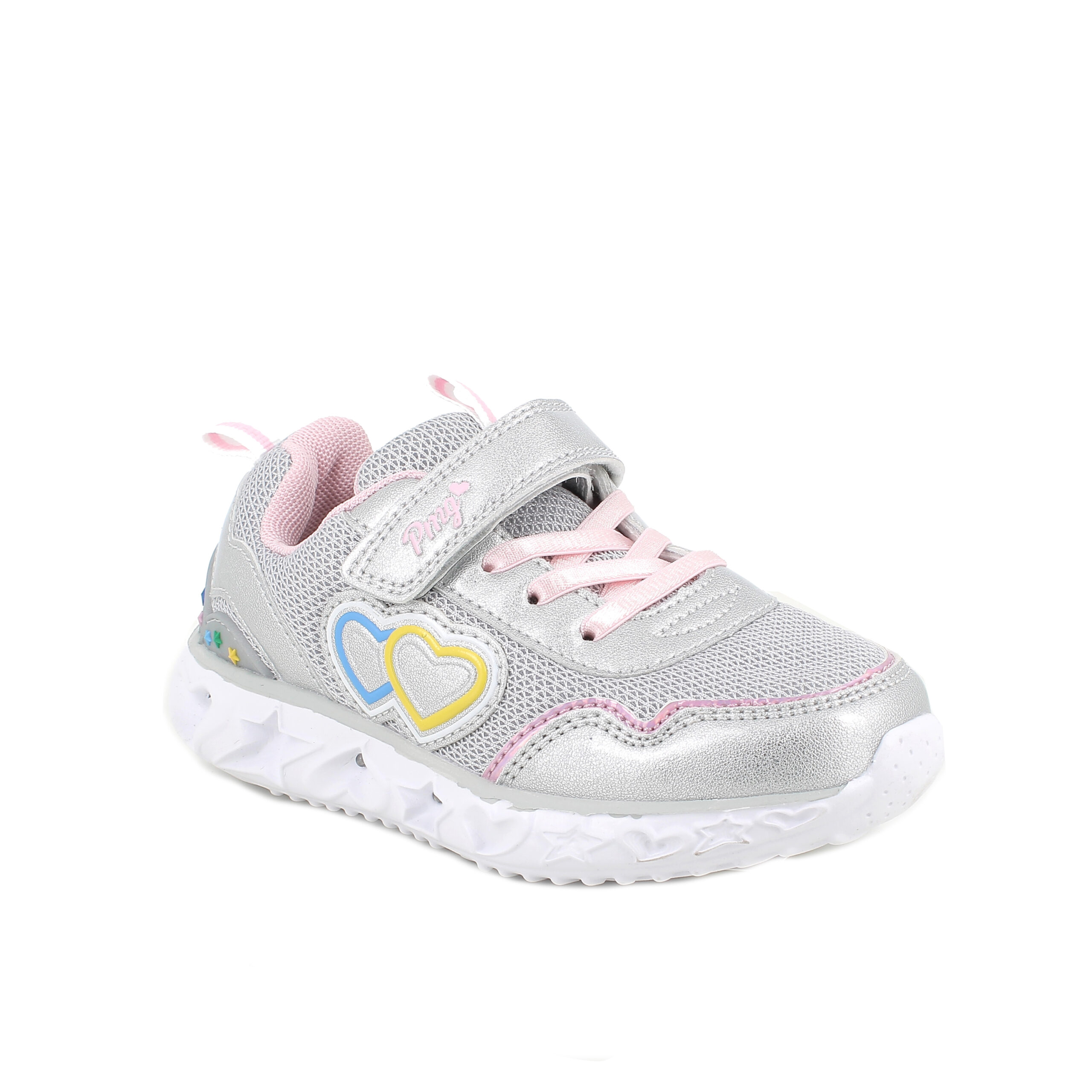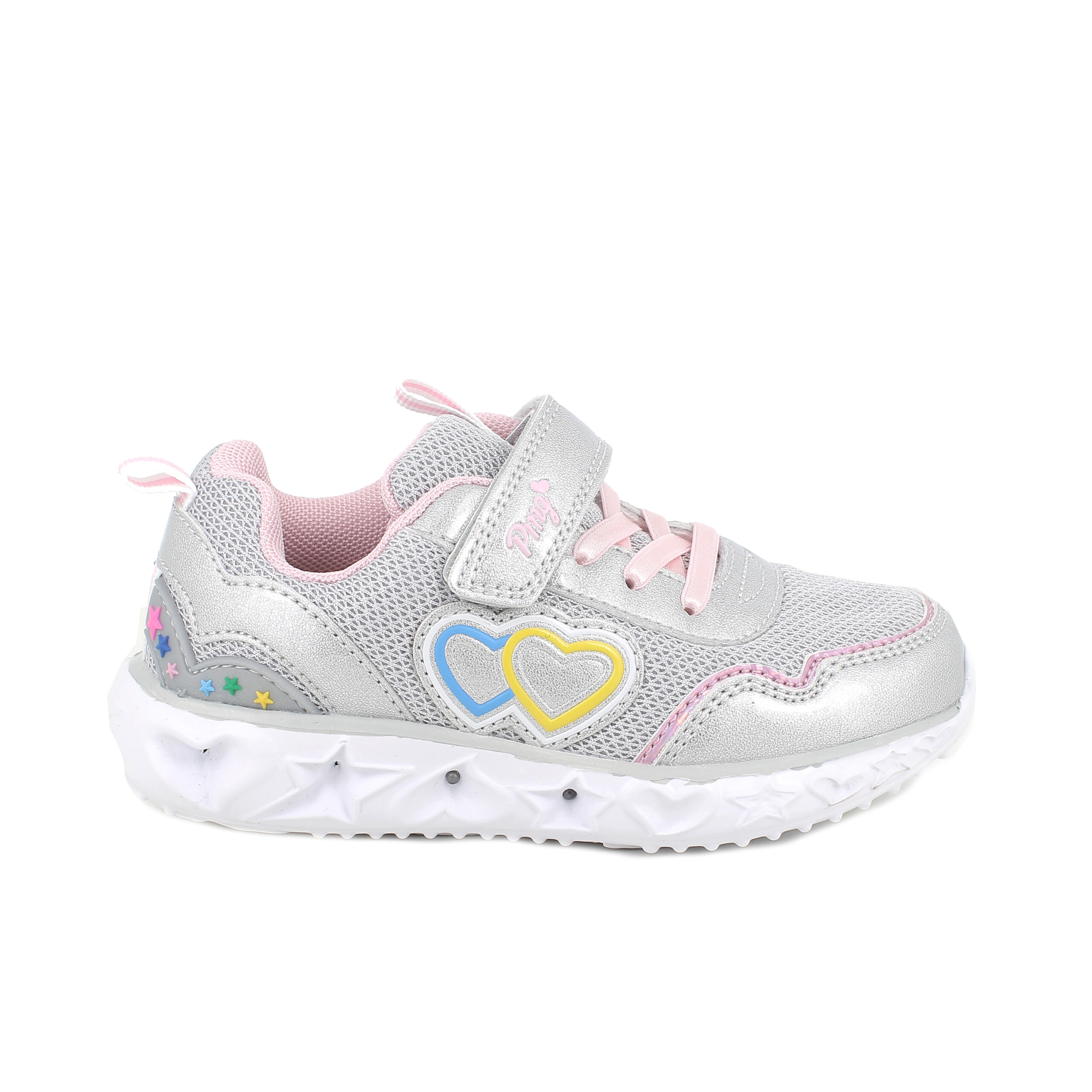 Lekkie i elastyczne półbuty dziecięce o sportowym kroju w kolorze srebrno – białym.
